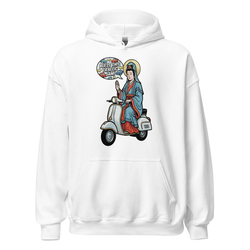 Elevate your style with this stunning Hoodie featuring Mazu, the Taiwanese Goddess of the Sea, blessing traffic jams on her scooter.