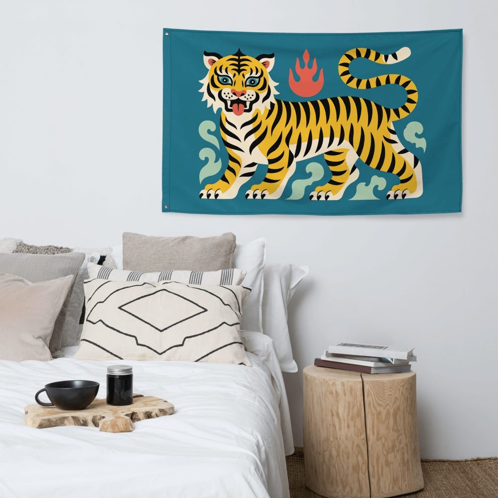 The design captures every detail of the original with stunning precision: a golden-yellow tiger prowls majestically across deep teal fabric, its bold black stripes creating dramatic contrast while oversized turquoise eyes seem to follow you. The sacred red flame floats above its head like a blessing, while pale mint clouds swirl beneath powerful paws, all rendered in authentic woodblock print aesthetics that honor traditional East Asian artistry.