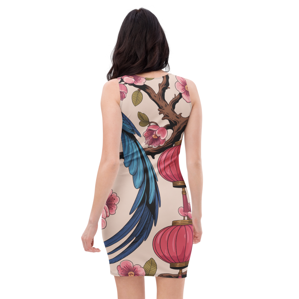 Indulge in the timeless beauty of Taiwan’s natural wonder with this captivating bodycon dress. Crafted with a refined feminine palette and a luxurious textile art style, the design seamlessly weaves the iconic Taiwan Blue Magpie among plum blossoms and lanterns, creating a mesmerizing pattern that flows with elegant elongated curves.
